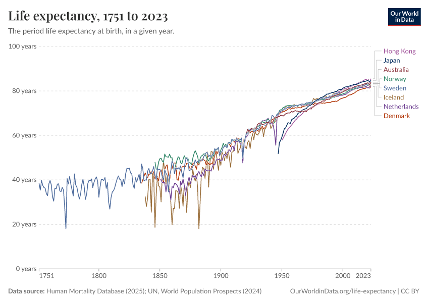Human Mortality Database (2025); UN, World Population Prospects (2024) – processed by Our World in Data. “Life expectancy at birth – HMD – totals, period tables” [dataset]. Human Mortality Database, “Human Mortality Database”; United Nations, “World Population Prospects” [original data]. Retrieved March 12, 2026 from https://bespoke-income-plots.owid.pages.dev/grapher/life-expectancy-hmd-unwpp