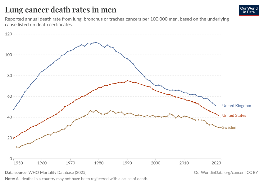 WHO Mortality Database (2025) – with minor processing by Our World in Data. “Lung cancer death rates in men” [dataset]. WHO Mortality Database, “WHO Mortality Database” [original data]. Retrieved March 12, 2026 from https://bespoke-income-plots.owid.pages.dev/grapher/lung-cancer-death-rates-males