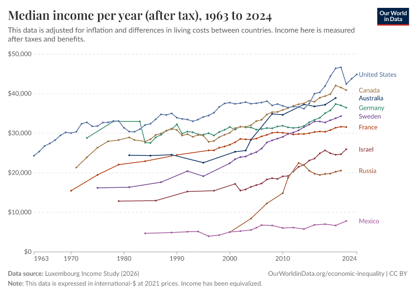 “Data Page: Median income per year (after tax)”, part of the following publication: Joe Hasell, Bertha Rohenkohl, Pablo Arriagada, Esteban Ortiz-Ospina, and Max Roser (2022) - “Poverty”. Data adapted from Luxembourg Income Study. Retrieved from https://bespoke-income-plots.owid.pages.dev/grapher/median-income-after-tax-lis [online resource]How to cite this data