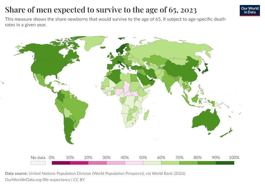 “Data Page: Share of men expected to survive to the age of 65”. Our World in Data (2026). Data adapted from United Nations Population Division (World Population Prospects), via World Bank. Retrieved from https://bespoke-income-plots.owid.pages.dev/grapher/men-survival-to-age-65 [online resource]How to cite this data
