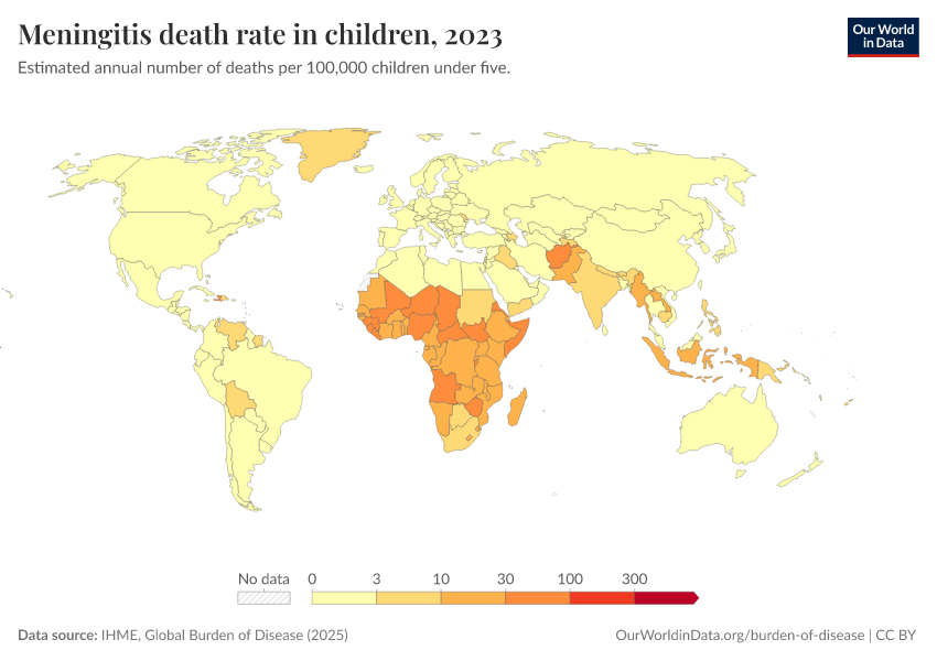 IHME, Global Burden of Disease (2025) – with major processing by Our World in Data. “Meningitis death rate in children” [dataset]. IHME, Global Burden of Disease, “Global Burden of Disease - Deaths” [original data]. Retrieved March 12, 2026 from https://bespoke-income-plots.owid.pages.dev/grapher/meningitis-death-rates-children-under-5