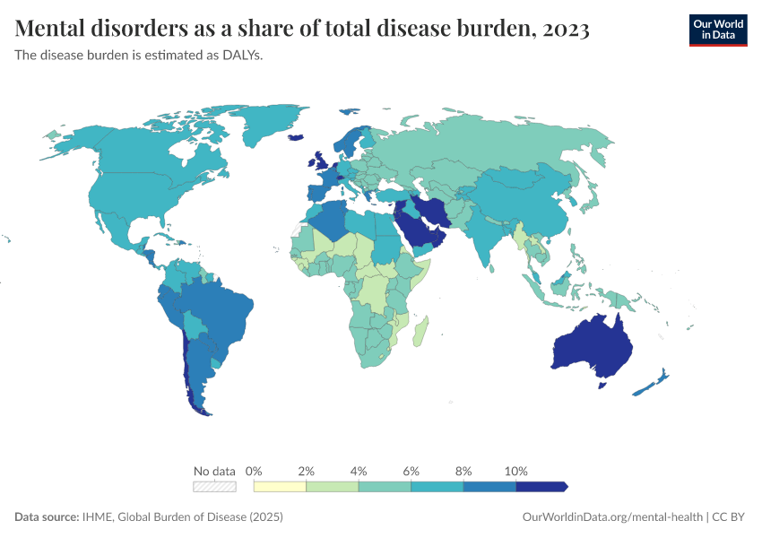 IHME, Global Burden of Disease (2025) – with major processing by Our World in Data. “Mental disorders as a share of total disease burden” [dataset]. IHME, Global Burden of Disease, “Global Burden of Disease - DALYs” [original data]. Retrieved March 12, 2026 from https://bespoke-income-plots.owid.pages.dev/grapher/mental-and-substance-use-as-share-of-disease