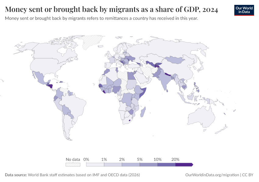 “Data Page: Money sent or brought back by migrants as a share of GDP”. Our World in Data (2026). Data adapted from World Bank staff estimates based on IMF and OECD data. Retrieved from https://bespoke-income-plots.owid.pages.dev/grapher/money-sent-or-brought-back-by-migrants-as-a-share-of-gdp [online resource]How to cite this data