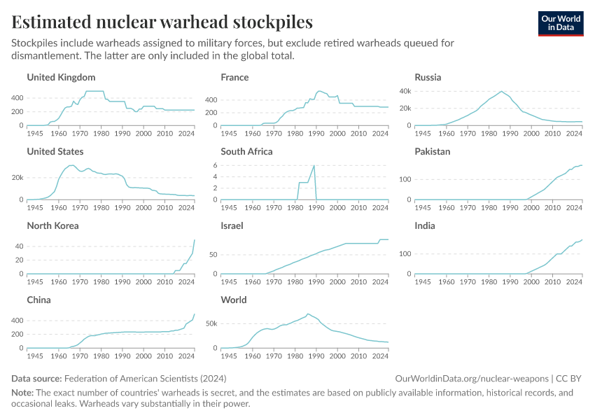 Federation of American Scientists (2024) – with minor processing by Our World in Data. “Estimated nuclear warhead stockpiles” [dataset]. Federation of American Scientists, “Estimated Global Nuclear Warhead Inventories” [original data]. Retrieved March 12, 2026 from https://bespoke-income-plots.owid.pages.dev/grapher/nuclear-warhead-stockpiles-lines