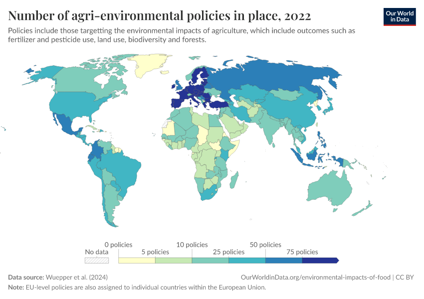 “Data Page: Number of agri-environmental policies in place”. Our World in Data (2026). Data adapted from Wuepper et al. (2024). Retrieved from https://bespoke-income-plots.owid.pages.dev/grapher/number-agri-environmental-policies [online resource]How to cite this data