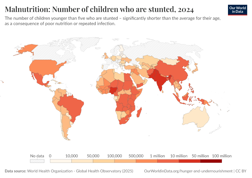 World Health Organization - Global Health Observatory (2025) – processed by Our World in Data. “Malnutrition: Number of children who are stunted” [dataset]. World Health Organization, “Global Health Observatory” [original data]. Retrieved March 12, 2026 from https://bespoke-income-plots.owid.pages.dev/grapher/number-children-stunted-who