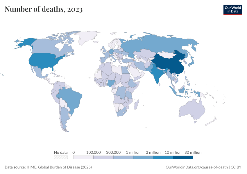 IHME, Global Burden of Disease (2025) – with major processing by Our World in Data. “Number of deaths” [dataset]. IHME, Global Burden of Disease, “Global Burden of Disease - Deaths” [original data]. Retrieved March 12, 2026 from https://bespoke-income-plots.owid.pages.dev/grapher/number-of-deaths-gbd