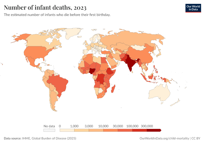 IHME, Global Burden of Disease (2025) – with minor processing by Our World in Data. “Number of infant deaths” [dataset]. IHME, Global Burden of Disease, “Global Burden of Disease - Child Mortality” [original data]. Retrieved March 12, 2026 from https://bespoke-income-plots.owid.pages.dev/grapher/number-of-infant-deaths-ihme