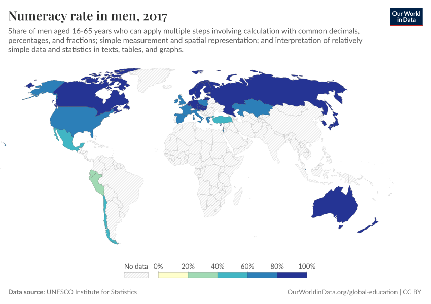 “Data Page: Numeracy rate in men”. Our World in Data (2026). Data adapted from UNESCO Institute for Statistics. Retrieved from https://bespoke-income-plots.owid.pages.dev/grapher/numeracy-rate-in-adult-men [online resource]How to cite this data