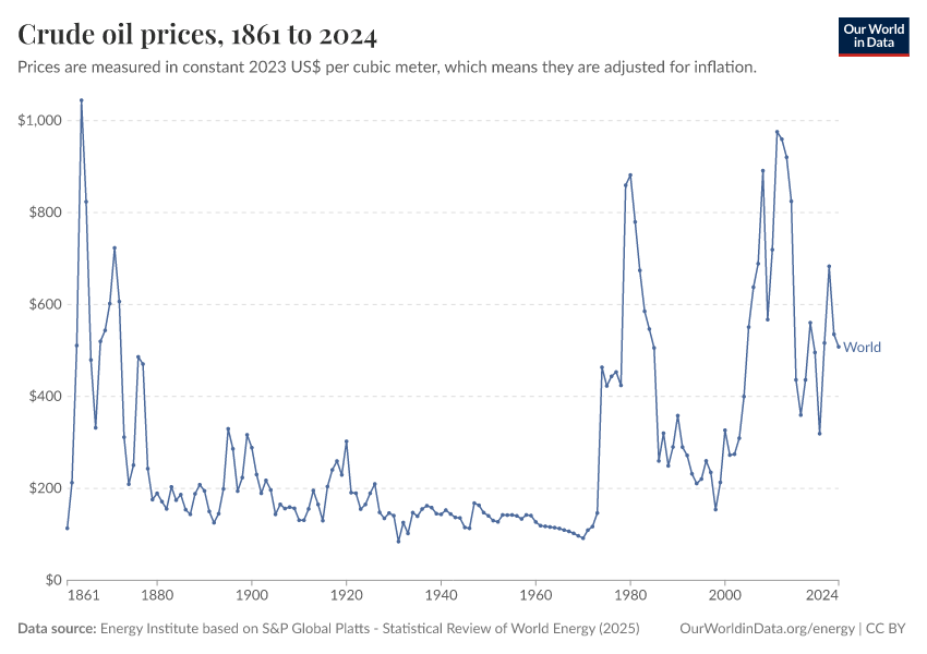 “Data Page: Oil price - Crude prices since 1861”, part of the following publication: Hannah Ritchie, Pablo Rosado, and Max Roser (2023) - “Energy”. Data adapted from Energy Institute. Retrieved from https://bespoke-income-plots.owid.pages.dev/grapher/oil-prices-inflation-adjusted [online resource]How to cite this data