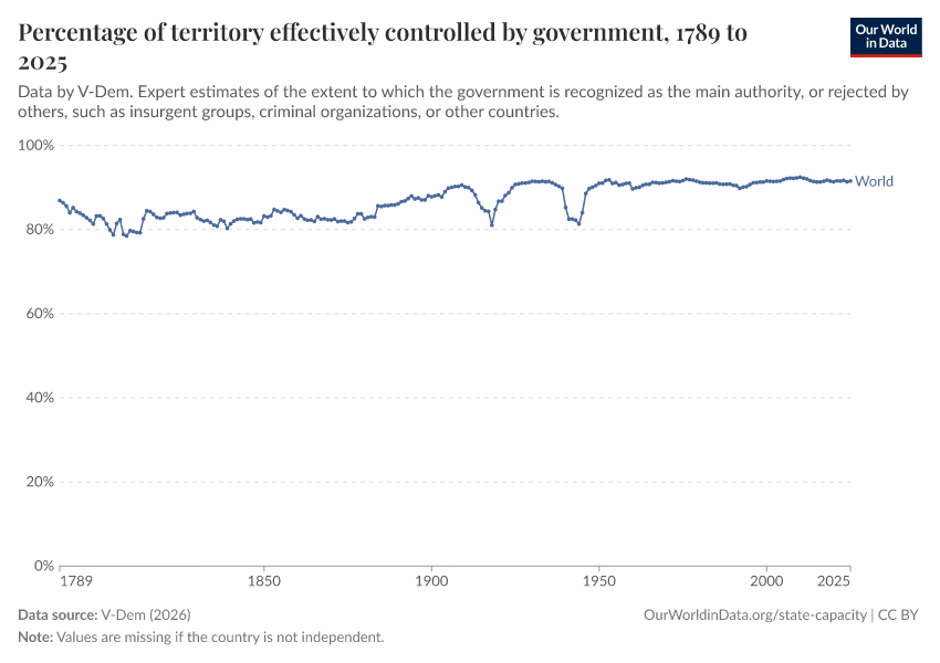 V-Dem (2025) – processed by Our World in Data. “Territory under state control – V-Dem” [dataset]. V-Dem, “Democracy report v15” [original data]. Retrieved March 12, 2026 from https://bespoke-income-plots.owid.pages.dev/grapher/percentage-of-territory-controlled-by-government