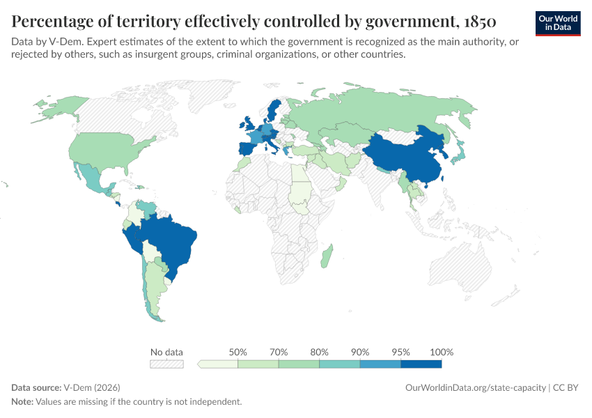 “Data Page: Territory under state control”, part of the following publication: Bastian Herre, Lucas Rodés-Guirao, and Esteban Ortiz-Ospina (2013) - “Democracy”. Data adapted from V-Dem. Retrieved from https://bespoke-income-plots.owid.pages.dev/grapher/percentage-of-territory-controlled-by-government [online resource]How to cite this data