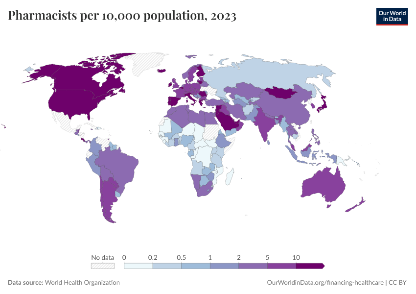 “Data Page: Pharmacists per 10,000 population”. Our World in Data (2026). Data adapted from World Health Organization. Retrieved from https://bespoke-income-plots.owid.pages.dev/grapher/pharmaceutical-personnel-per-1000 [online resource]How to cite this data