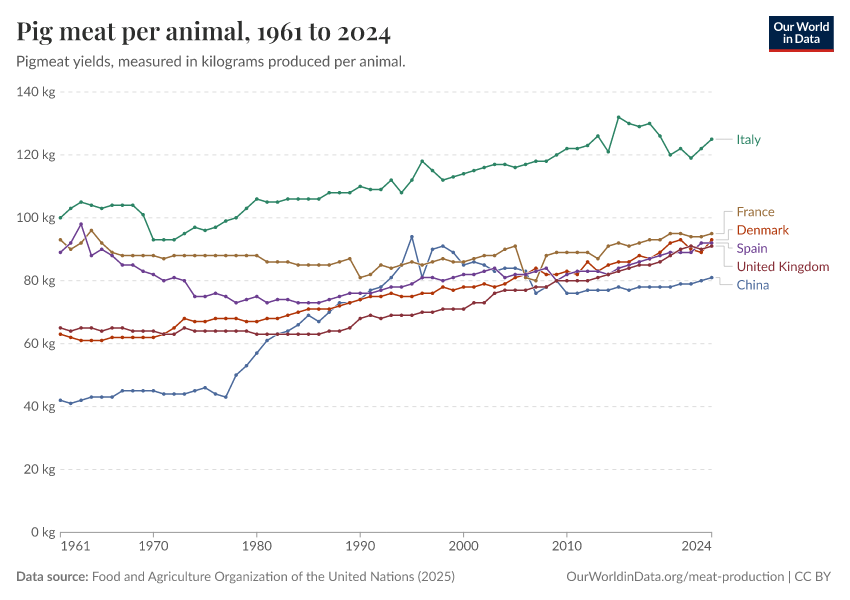 Food and Agriculture Organization of the United Nations (2025) – with major processing by Our World in Data. “Pig meat yield per animal – UN FAO” [dataset]. Food and Agriculture Organization of the United Nations, “Production: Crops and livestock products” [original data]. Retrieved March 12, 2026 from https://bespoke-income-plots.owid.pages.dev/grapher/pig-yields-meat-per-animal-in-hectograms-100-grams