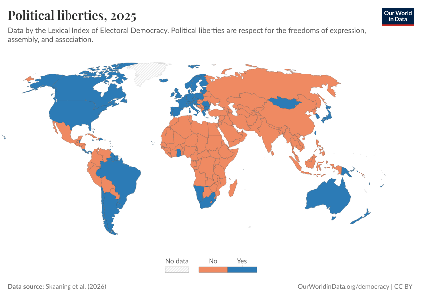 Skaaning et al. (2025) – processed by Our World in Data. “Political liberties” [dataset]. Skaaning et al., “Lexical Index of Electoral Democracy (LIED) v6.8” [original data]. Retrieved March 12, 2026 from https://bespoke-income-plots.owid.pages.dev/grapher/political-liberties-lexical
