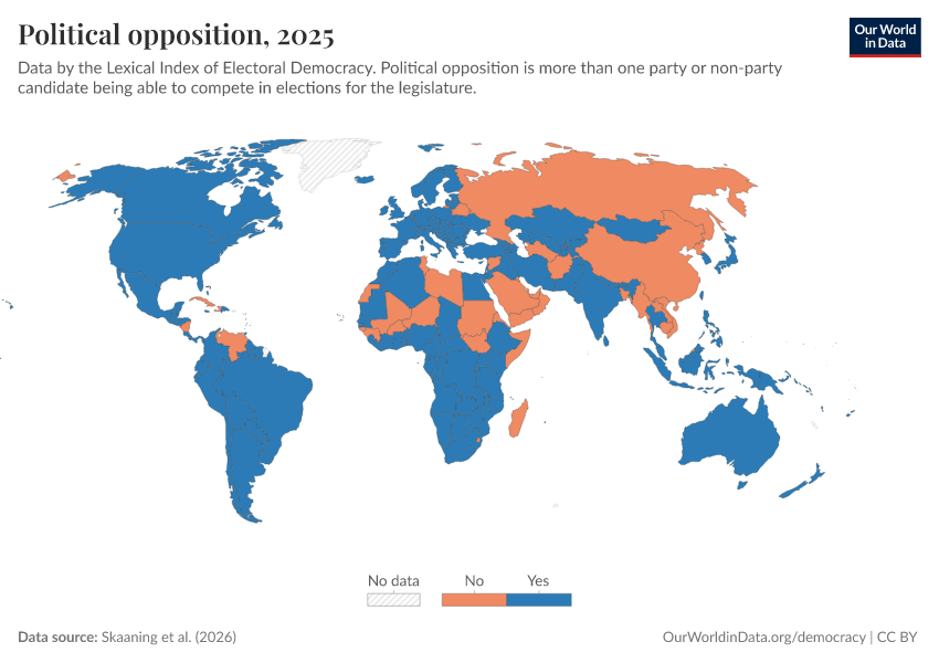 Skaaning et al. (2025) – processed by Our World in Data. “Political opposition” [dataset]. Skaaning et al., “Lexical Index of Electoral Democracy (LIED) v6.8” [original data]. Retrieved March 12, 2026 from https://bespoke-income-plots.owid.pages.dev/grapher/political-opposition-lexical