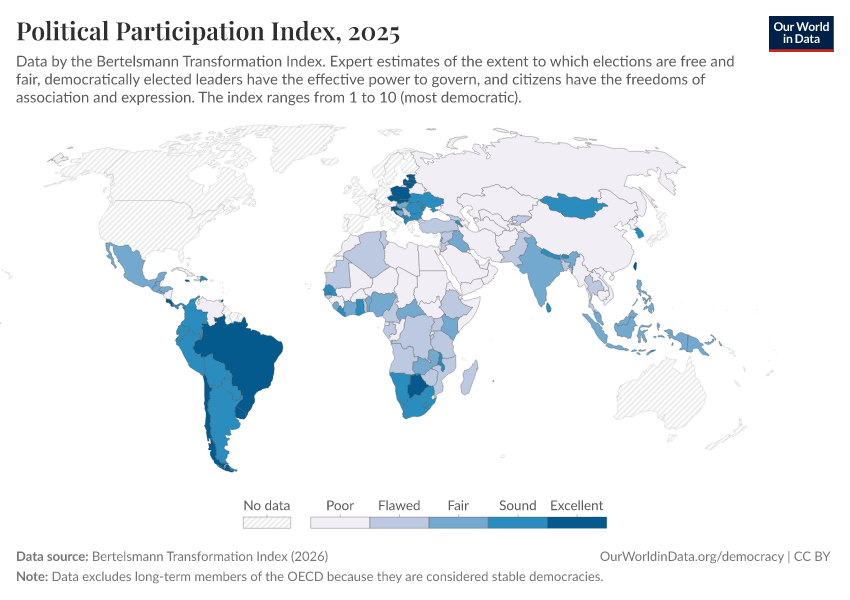Bertelsmann Transformation Index (2024) – processed by Our World in Data. “Political Participation Index” [dataset]. Bertelsmann Transformation Index, “Bertelsmann Transformation Index, Scores” [original data]. Retrieved March 12, 2026 from https://bespoke-income-plots.owid.pages.dev/grapher/political-participation-index-bti