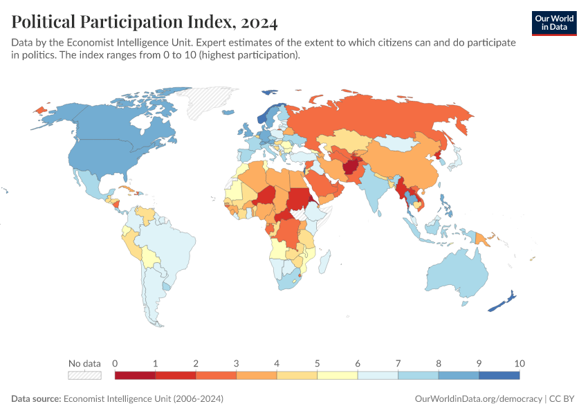 “Data Page: Political Participation Index”, part of the following publication: Bastian Herre, Lucas Rodés-Guirao, and Esteban Ortiz-Ospina (2013) - “Democracy”. Data adapted from Economist Intelligence Unit, Gapminder, Various sources. Retrieved from https://bespoke-income-plots.owid.pages.dev/grapher/political-participation-index-eiu [online resource]How to cite this data