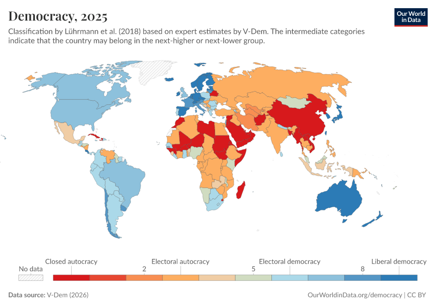 V-Dem (2025) – processed by Our World in Data. “Political regime – inc. ambiguous categories” [dataset]. V-Dem, “Democracy report v15” [original data]. Retrieved March 12, 2026 from https://bespoke-income-plots.owid.pages.dev/grapher/political-regime-amb-row