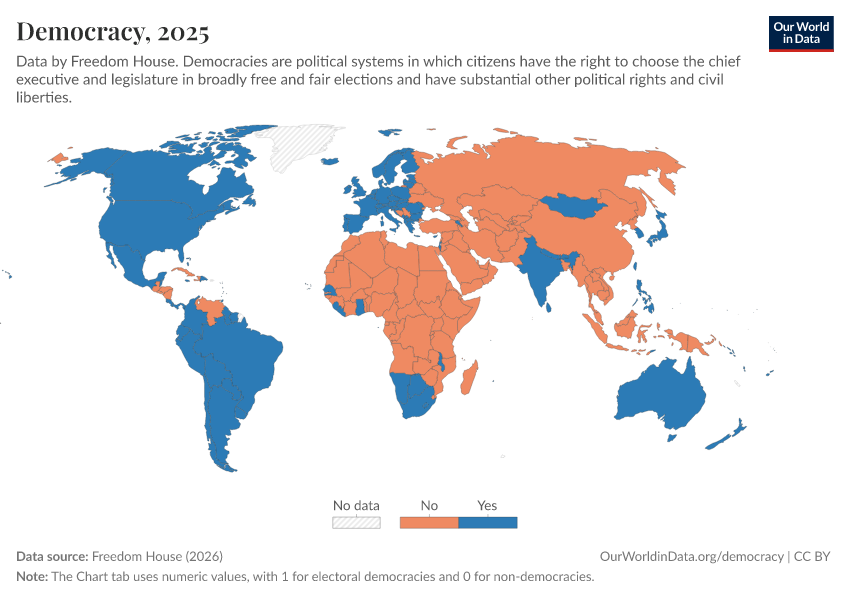 Freedom House (2025) – processed by Our World in Data. “Democracy” [dataset]. Freedom House, “Freedom in the World” [original data]. Retrieved March 12, 2026 from https://bespoke-income-plots.owid.pages.dev/grapher/political-regime-dem-fh