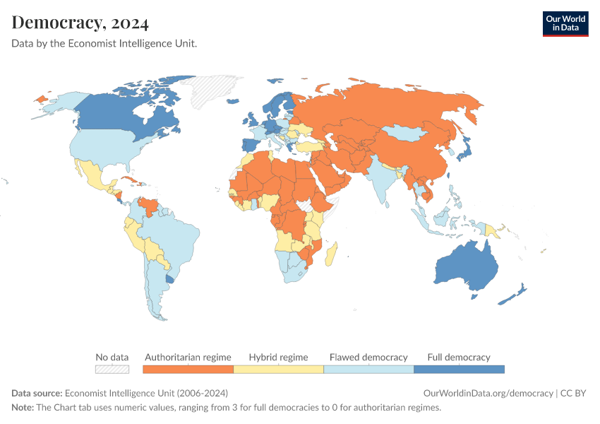 Economist Intelligence Unit (2006-2024) – processed by Our World in Data. “Democracy” [dataset]. Economist Intelligence Unit, “Democracy Index 2021: The China challenge”; Economist Intelligence Unit, “Democracy Index 2022: Frontline democracy and the battle for Ukraine”; Economist Intelligence Unit, “Democracy Index 2023: Age of Conflict”; Economist Intelligence Unit, “Democracy Index 2024: What's wrong with representative democracy?”; Gapminder, “Democracy Index v4” [original data]. Retrieved March 12, 2026 from https://bespoke-income-plots.owid.pages.dev/grapher/political-regime-eiu