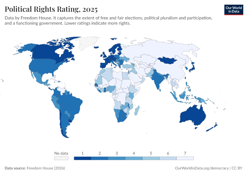 Freedom House (2025) – processed by Our World in Data. “Political rights rating” [dataset]. Freedom House, “Freedom in the World” [original data]. Retrieved March 12, 2026 from https://bespoke-income-plots.owid.pages.dev/grapher/political-rights-rating-fh