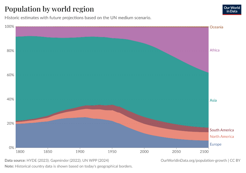 “Data Page: Population by world region”, part of the following publication: Hannah Ritchie, Lucas Rodés-Guirao, Edouard Mathieu, Marcel Gerber, Esteban Ortiz-Ospina, Joe Hasell, and Max Roser (2023) - “Population Growth”. Data adapted from PBL Netherlands Environmental Assessment Agency, Gapminder, United Nations. Retrieved from https://bespoke-income-plots.owid.pages.dev/grapher/population-regions-with-projections [online resource]