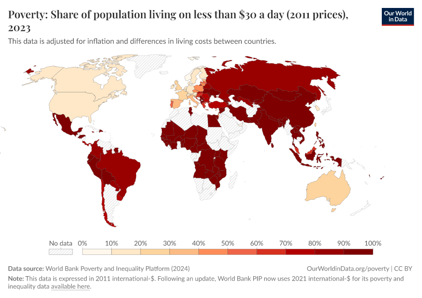 World Bank Poverty and Inequality Platform (2024) – with major processing by Our World in Data. “Poverty: Share of population living on less than $30 a day (2011 prices) – World Bank” [dataset]. World Bank Poverty and Inequality Platform, “World Bank Poverty and Inequality Platform (PIP) 20240627_2017, 20240627_2011” [original data]. Retrieved March 12, 2026 from https://bespoke-income-plots.owid.pages.dev/grapher/poverty-share-on-less-than-30-per-day-2011-ppp