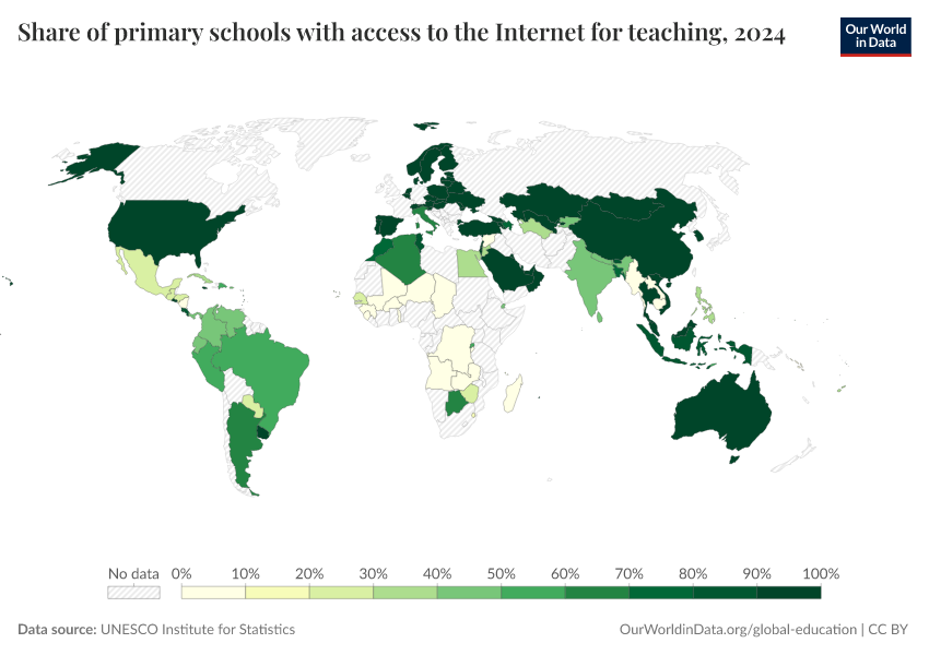 “Data Page: Share of primary schools with access to the Internet for teaching”. Our World in Data (2026). Data adapted from UNESCO Institute for Statistics. Retrieved from https://bespoke-income-plots.owid.pages.dev/grapher/primary-schools-with-access-to-internet [online resource]How to cite this data