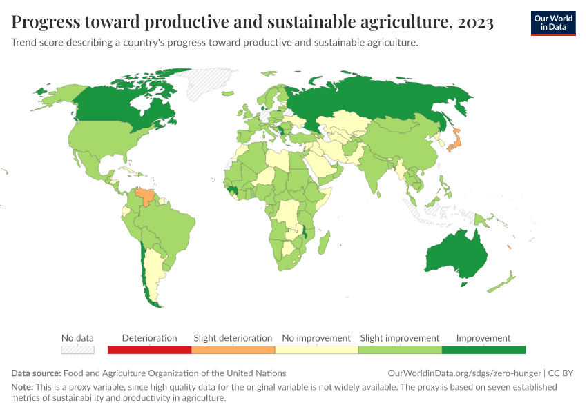 “Data Page: Progress toward productive and sustainable agriculture”. Our World in Data (2026). Data adapted from Food and Agriculture Organization of the United Nations. Retrieved from https://bespoke-income-plots.owid.pages.dev/grapher/progress-toward-productive-and-sustainable-agriculture [online resource]How to cite this data