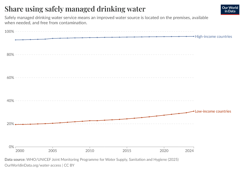 WHO/UNICEF Joint Monitoring Programme for Water Supply, Sanitation and Hygiene (2025) – processed by Our World in Data. “Share using safely managed drinking water” [dataset]. World Health Organization/UNICEF Joint Monitoring Programme for Water Supply, Sanitation and Hygiene, “WHO/UNICEF Joint Monitoring Programme for Water Supply, Sanitation and Hygiene (JMP) 2000-2024 report” [original data]. Retrieved March 12, 2026 from https://bespoke-income-plots.owid.pages.dev/grapher/proportion-using-safely-managed-drinking-water