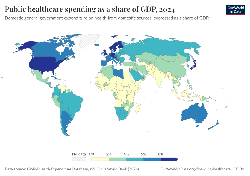 “Data Page: Public healthcare spending as a share of GDP”. Our World in Data (2026). Data adapted from Global Health Expenditure Database, WHO, via World Bank. Retrieved from https://bespoke-income-plots.owid.pages.dev/grapher/public-healthcare-spending-share-gdp [online resource]How to cite this data