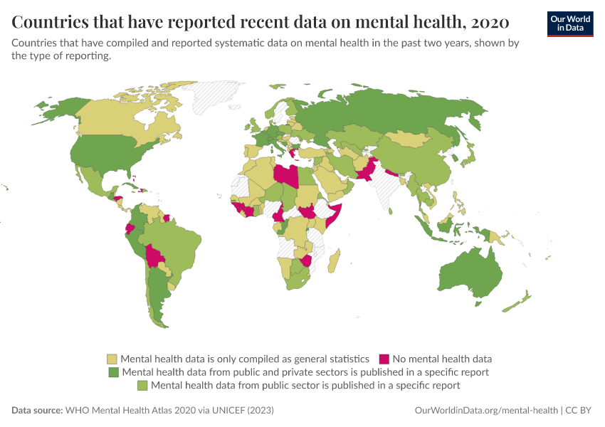 “Data Page: Countries that have reported recent data on mental health”, part of the following publication: Saloni Dattani, Lucas Rodés-Guirao, Hannah Ritchie, and Max Roser (2023) - “Mental Health”. Data adapted from WHO Mental Health Atlas 2020 via UNICEF. Retrieved from https://bespoke-income-plots.owid.pages.dev/grapher/reporting-of-mental-health-system-data-in-the-past-two-years [online resource]How to cite this data