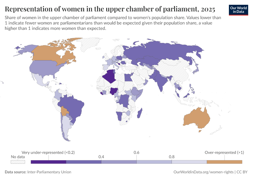 “Data Page: Representation of women in the upper chamber of parliament”. Our World in Data (2026). Data adapted from Inter-Parliamentary Union. Retrieved from https://bespoke-income-plots.owid.pages.dev/grapher/representation-of-women-in-the-upper-chamber-of-parliament [online resource]How to cite this data