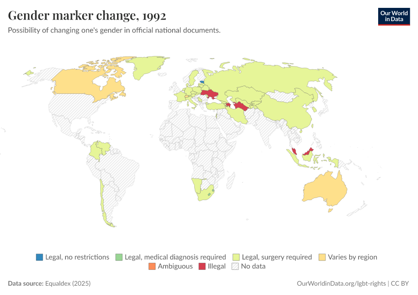 “Data Page: Gender marker change”, part of the following publication: Bastian Herre and Pablo Arriagada (2023) - “LGBT+ Rights”. Data adapted from Equaldex. Retrieved from https://bespoke-income-plots.owid.pages.dev/grapher/right-to-change-legal-gender-equaldex [online resource]
