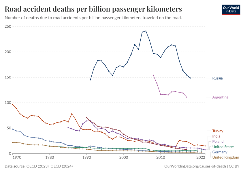 “Data Page: Road accident deaths per billion passenger kilometers”, part of the following publication: Hannah Ritchie and Max Roser (2021) - “Transport”. Data adapted from OECD. Retrieved from https://bespoke-income-plots.owid.pages.dev/grapher/road-accident-deaths-per-passenger-kilometers [online resource]