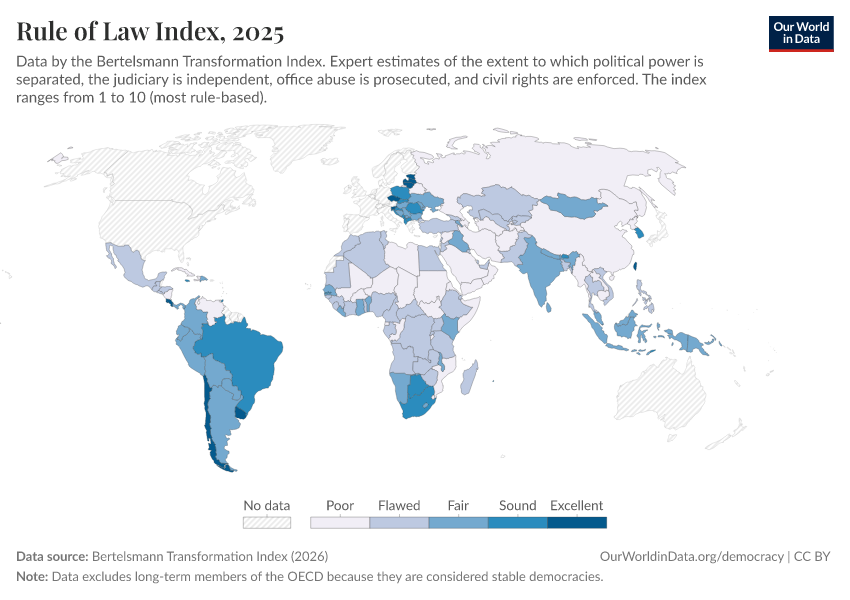 Bertelsmann Transformation Index (2024) – processed by Our World in Data. “Rule of Law Index” [dataset]. Bertelsmann Transformation Index, “Bertelsmann Transformation Index, Scores” [original data]. Retrieved March 12, 2026 from https://bespoke-income-plots.owid.pages.dev/grapher/rule-of-law-index-bti