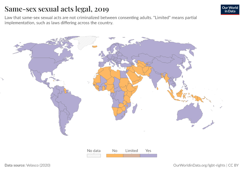“Data Page: Same-sex sexual acts legal”, part of the following publication: Bastian Herre and Pablo Arriagada (2023) - “LGBT+ Rights”. Data adapted from Velasco. Retrieved from https://bespoke-income-plots.owid.pages.dev/grapher/same-sex-sexual-acts-legal [online resource]How to cite this data