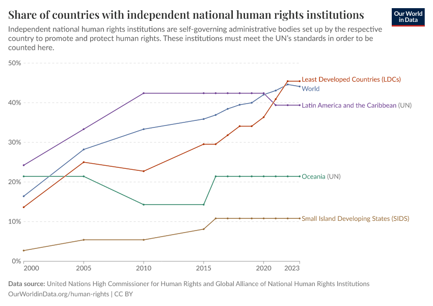 United Nations High Commissioner for Human Rights and Global Alliance of National Human Rights Institutions – processed by Our World in Data. “Share of countries with independent national human rights institutions” [dataset]. United Nations High Commissioner for Human Rights and Global Alliance of National Human Rights Institutions, “Source: The Office of the United Nations High Commissioner for Human Rights (OHCHR) in collaboration with Global Alliance of National Human Rights Institutions (GANHRI).” [original data]. Retrieved March 12, 2026 from https://bespoke-income-plots.owid.pages.dev/grapher/share-countries-accredited-independent-national-human-rights-institutions