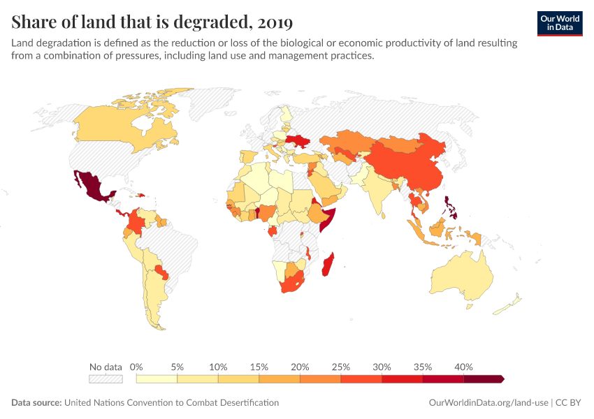 United Nations Convention to Combat Desertification – processed by Our World in Data. “Share of land that is degraded” [dataset]. United Nations Convention to Combat Desertification, “Data from multiple sources” [original data]. Retrieved March 12, 2026 from https://bespoke-income-plots.owid.pages.dev/grapher/share-degraded-land