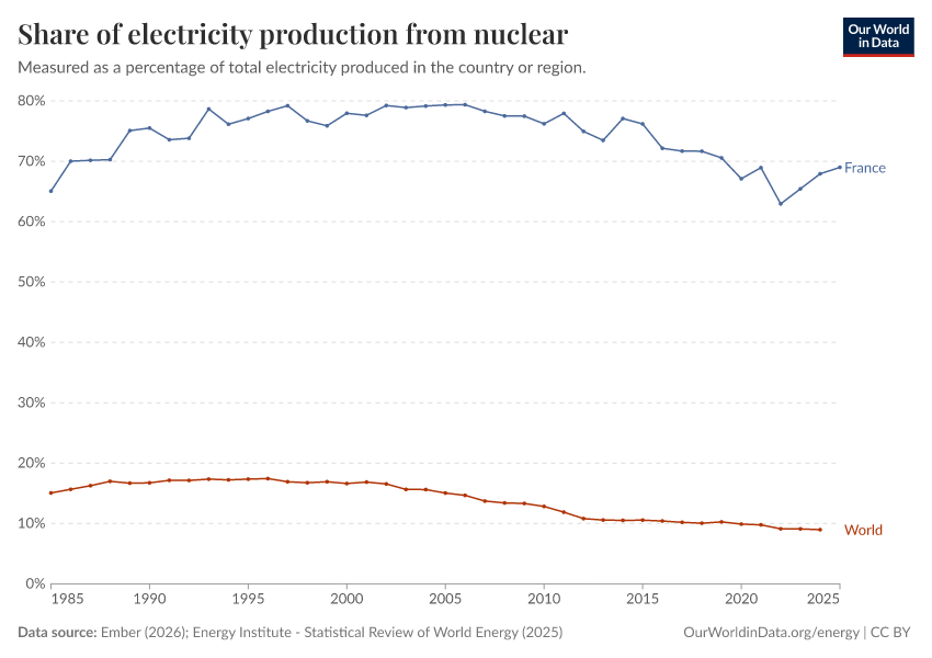 Ember (2026); Energy Institute - Statistical Review of World Energy (2025) – with major processing by Our World in Data. “Share of electricity generated by nuclear power” [dataset]. Ember, “Yearly Electricity Data Europe”; Ember, “Yearly Electricity Data”; Energy Institute, “Statistical Review of World Energy” [original data]. Retrieved March 12, 2026 from https://bespoke-income-plots.owid.pages.dev/grapher/share-electricity-nuclear