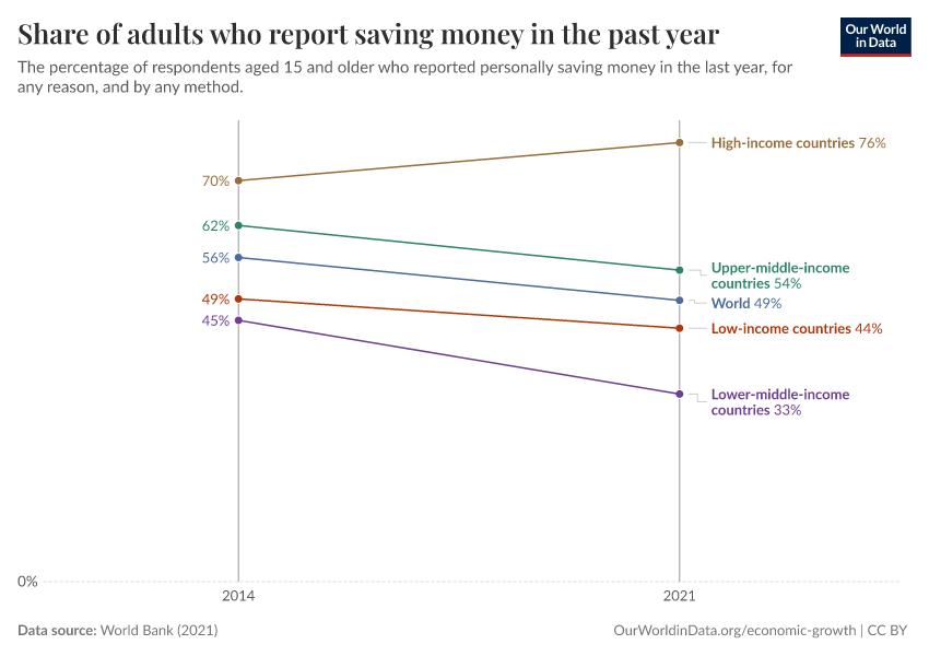 “Data Page: Share of adults who report saving money in the past year”, part of the following publication: Max Roser, Bertha Rohenkohl, Pablo Arriagada, Joe Hasell, Hannah Ritchie, and Esteban Ortiz-Ospina (2023) - “Economic Growth”. Data adapted from World Bank. Retrieved from https://bespoke-income-plots.owid.pages.dev/grapher/share-of-adults-who-report-saving-money-in-the-past-year [online resource]How to cite this data
