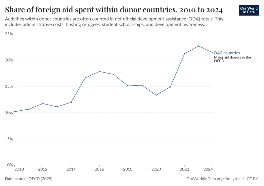 OECD (2025) – with minor processing by Our World in Data. “Share of foreign aid spent within donor countries – Net disbursements” [dataset]. OECD, “OECD Official Development Assistance (ODA) - DAC1: Flows by provider (ODA+OOF+Private)” [original data]. Retrieved March 12, 2026 from https://bespoke-income-plots.owid.pages.dev/grapher/share-of-foreign-aid-spent-within-donor-countries