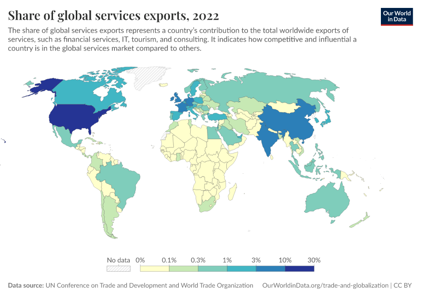 “Data Page: Share of global services exports”. Our World in Data (2026). Data adapted from UN Conference on Trade and Development and World Trade Organization. Retrieved from https://bespoke-income-plots.owid.pages.dev/grapher/share-of-global-services-exports [online resource]How to cite this data