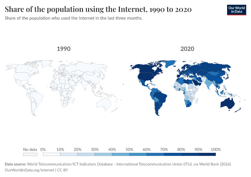 World Telecommunication/ICT Indicators Database - International Telecommunication Union (ITU), via World Bank (2026) – with minor processing by Our World in Data. “Share of the population using the Internet – International Telecommunication Union” [dataset]. World Telecommunication/ICT Indicators Database - International Telecommunication Union (ITU), via World Bank, “World Development Indicators 125” [original data]. Retrieved March 12, 2026 from https://bespoke-income-plots.owid.pages.dev/grapher/share-of-individuals-using-the-internet