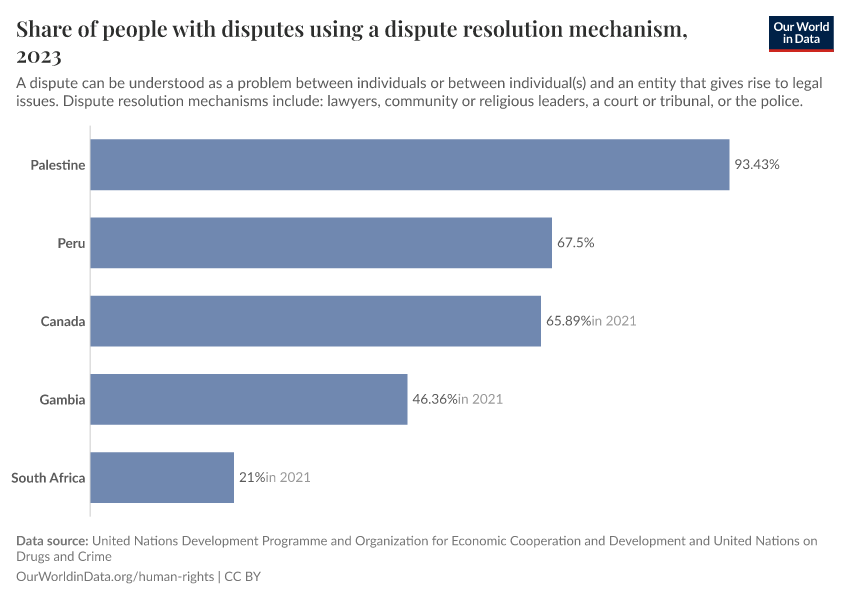 United Nations Development Programme and Organization for Economic Cooperation and Development and United Nations on Drugs and Crime – processed by Our World in Data. “Share of people with disputes using a dispute resolution mechanism” [dataset]. United Nations Development Programme and Organization for Economic Cooperation and Development and United Nations on Drugs and Crime, “Data from multiple sources” [original data]. Retrieved March 12, 2026 from https://bespoke-income-plots.owid.pages.dev/grapher/share-of-people-with-disputes-using-a-dispute-resolution-mechanism