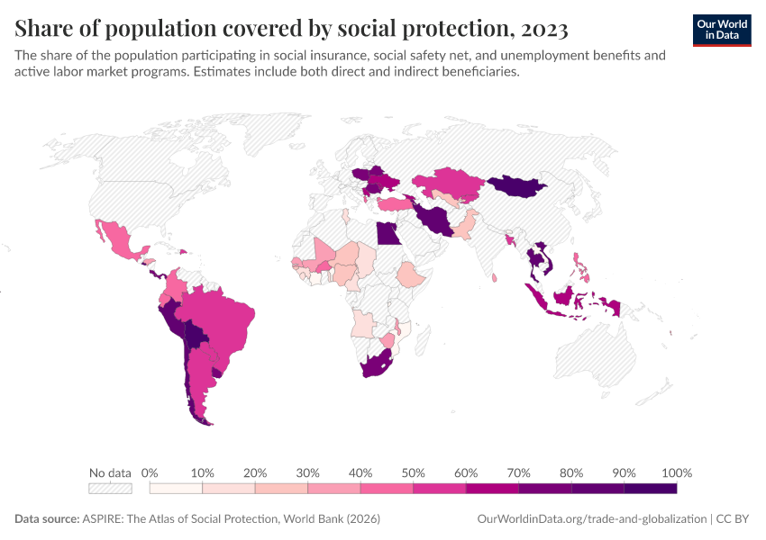 “Data Page: Share of population covered by social protection”. Our World in Data (2026). Data adapted from ASPIRE: The Atlas of Social Protection, World Bank. Retrieved from https://bespoke-income-plots.owid.pages.dev/grapher/share-of-population-covered-by-social-protection [online resource]How to cite this data