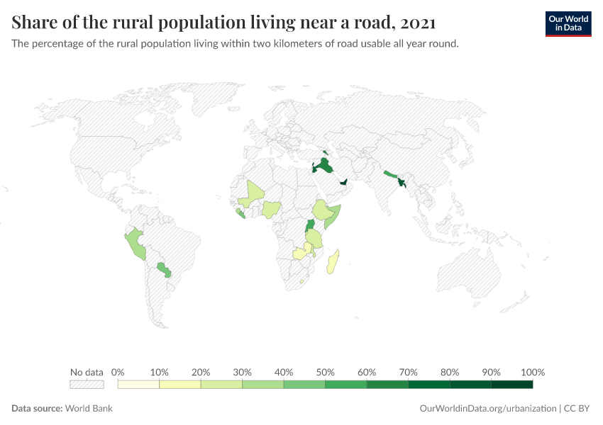 “Data Page: Share of the rural population living near a road”. Our World in Data (2026). Data adapted from World Bank. Retrieved from https://bespoke-income-plots.owid.pages.dev/grapher/share-of-rural-population-near-a-road [online resource]How to cite this data