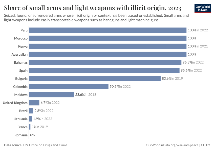 “Data Page: Share of small arms and light weapons with illicit origin”. Our World in Data (2026). Data adapted from UN Office on Drugs and Crime. Retrieved from https://bespoke-income-plots.owid.pages.dev/grapher/share-of-small-with-illicit-origin [online resource]How to cite this data