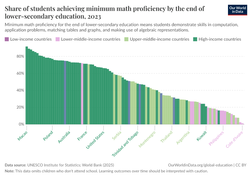 UNESCO Institute for Statistics – processed by Our World in Data. “Share of students achieving minimum math proficiency by the end of lower-secondary education” [dataset]. UNESCO Institute for Statistics, “Data from multiple sources” [original data]. Retrieved March 12, 2026 from https://bespoke-income-plots.owid.pages.dev/grapher/share-of-students-at-end-of-lower-secondary-education-achieving-minimum-math-proficiency